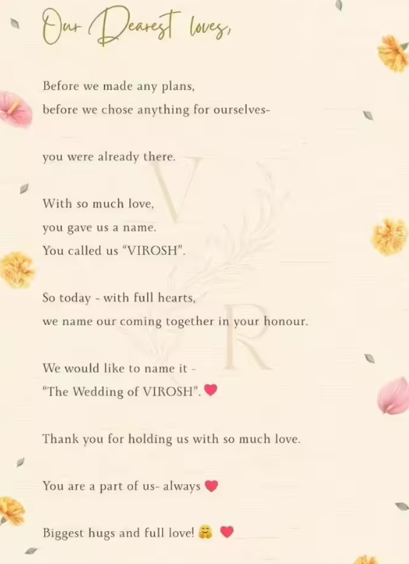 कार्ड में दिखा ‘विरोष’ नाम, फैंस को समर्पित मिलन