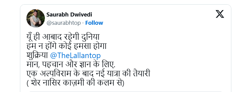 अपने संदेश में सौरभ द्विवेदी ने मशहूर शायर नासिर काज़मी की पंक्तियां लिखीं—“यूँ ही आबाद रहेगी दुनिया, हम न होंगे कोई हमसा होगा।” इसके बाद उन्होंने लल्लनटॉप को मान, पहचान और सीख देने के लिए धन्यवाद कहा। लेकिन जिस बात ने सबसे ज्यादा ध्यान खींचा, वह था उनका आखिरी वाक्य—“एक अल्पविराम के बाद नई यात्रा की तैयारी।” यहां उन्होंने ‘पूर्ण विराम’ नहीं लिखा, बल्कि ‘अल्पविराम’ चुना। मीडिया जगत इसे इस ओर इशारा मान रहा है कि सौरभ पत्रकारिता छोड़ नहीं रहे, बल्कि अपने करियर को नई दिशा दे रहे हैं। चर्चाओं के मुताबिक, वे किसी बड़े चैनल में जाने के बजाय अपना खुद का मीडिया प्लेटफॉर्म शुरू करने की तैयारी में हैं, जहां वे बिना किसी सीमाओं के अपने अंदाज में काम कर सकेंगे।